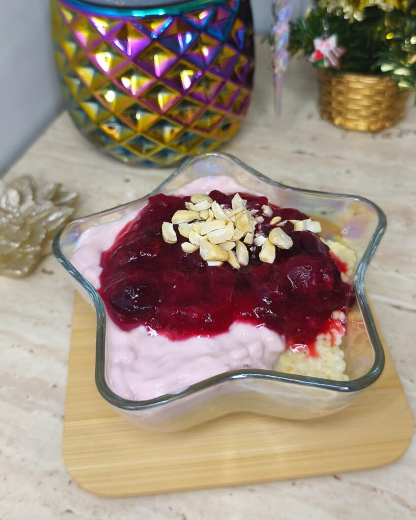 4. Ugotowaną kaszę przełożyć do miseczki, nałożyć na nią jogurt, ugotowaną żurawinę